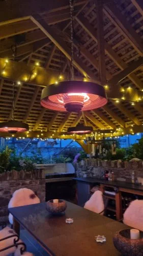 To heat this large area it was decided that the Herschel Hawaii heater would be the best fit due to it’s large area of coverage and ability to be suspended from the ceiling, above the big dining table in the centre of the area. The large wooden structure covering the area was incredibly stable allowing the heaters to be suspended from it. Four Hawaii heaters were specified for the area, hanging over the table to provide cosy warmth for diners and their warm glow provides the perfect fit for the beautiful setting.