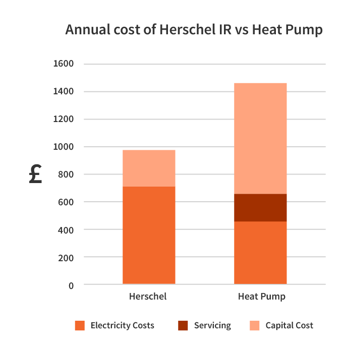 Infrared offers high levels of thermal comfort at lower air temperatures. When total costs of ownership of a heat pump versus infrared heating are considered over the lifetime of the heating (purchase, installation, running, maintenance, replacement) infrared presents a very compelling picture.
