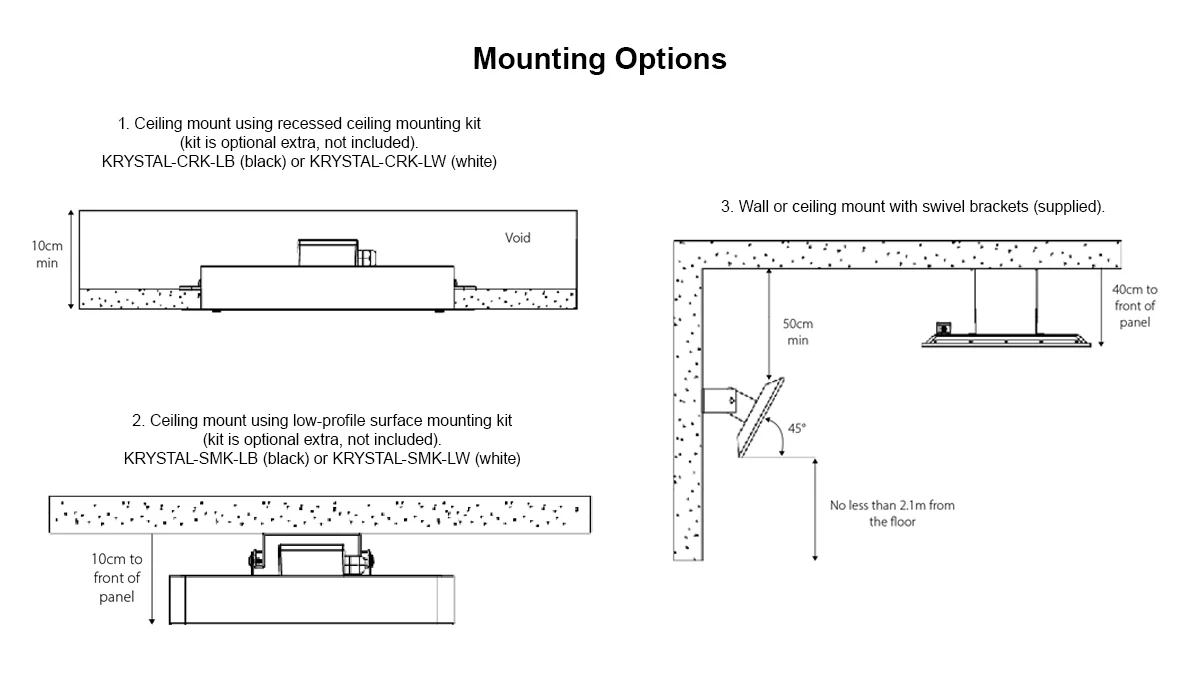 Krystal has a high surface temperature and must be installed out of reach. Minimum ceiling heights of 2.4m are advised for ceiling mounting. Minimum 2.1m mounting height is required for wall mounting.