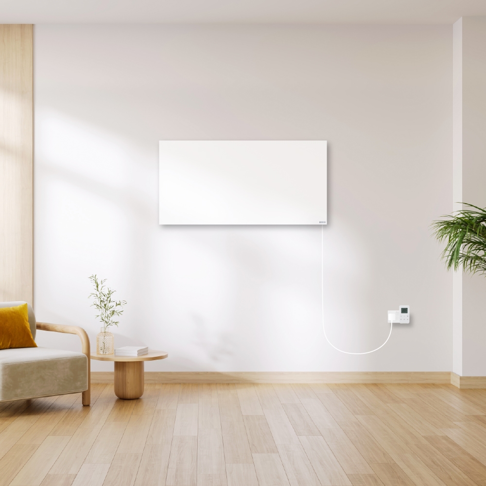 The Herschel Select XLS Easy DIY is the simplest way to enjoy the comfort of infrared heating. This package includes a frameless Select XLS panel heater (four sizes) and a plug-in T-PL thermostat, allowing you to quickly mount the panel with the EasyFix system, plug it in, pair the thermostat, and start heating. Control is effortless: set schedules directly on the thermostat, or connect via the SmartLife App for App and voice control (Alexa/Google Assistant). Stylish, efficient, and maintenance-free heating for homes, garden rooms and home offices. 5-year warranty included.